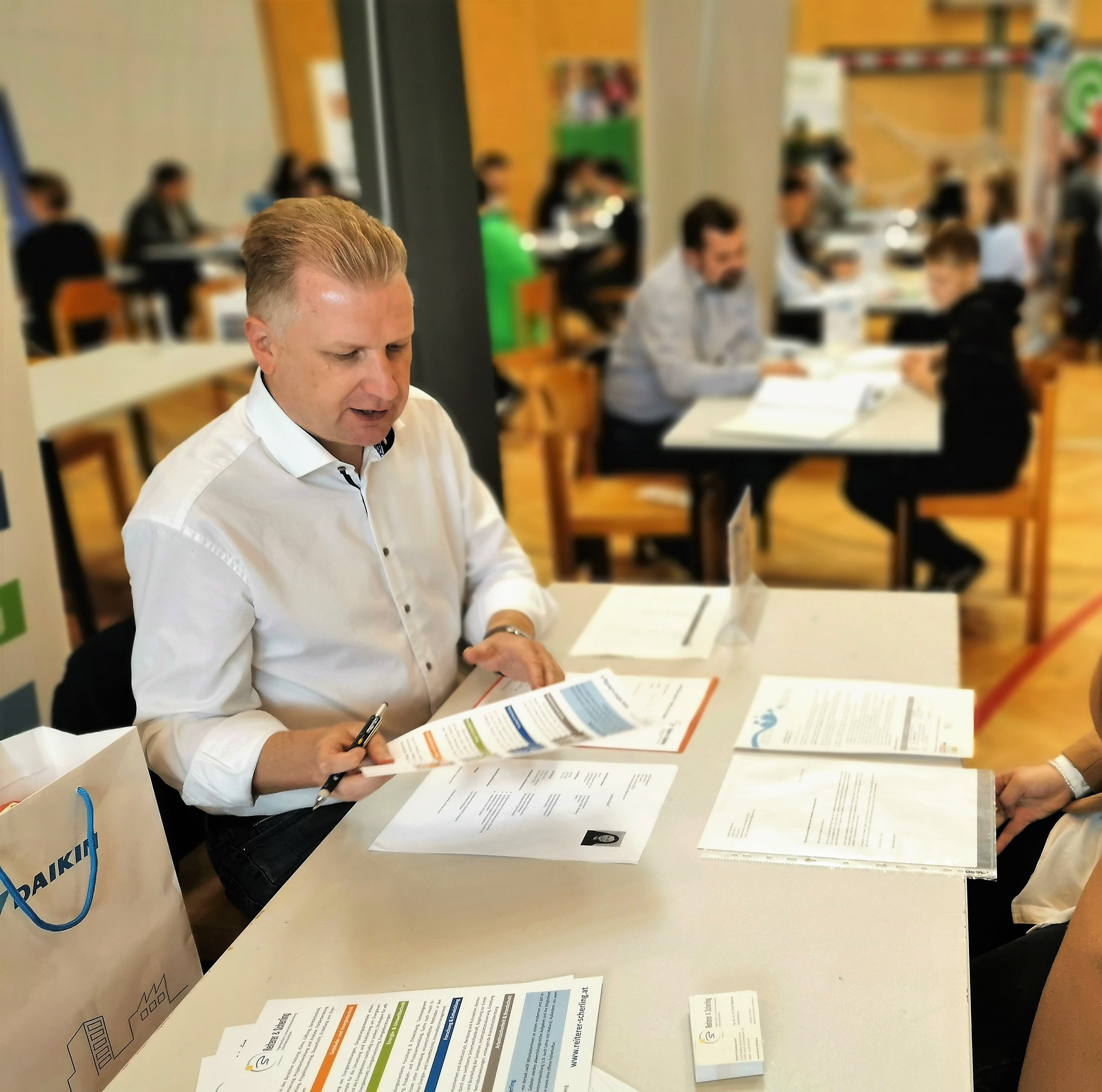 Im Rahmen des von der Wirtschaftsregion Hartberg und der Wirschaftskammer Harberg-Fürstenfeld veranstalteten Lehrlings-Speed-Datings am 20.10.2022 in der Stadtwerke Hartberghalle konnte sich unser Geschäftsführer Ernst Reiterer mit einigen KandidatInnen über spannende Aufgaben in unserem Unternehmen unterhalten. Die zur Wahl stehenden Lehrberufe bei Reiterer & Scherling sind Bürokauffmann/frau und Technische/r Zeichner/in. Die Interessenten hatten acht Minuten lang Gelegenheit sich zu präsentieren und es konnten auch in der kurzen Zeit aufschlussreiche Gespräche geführt werden.