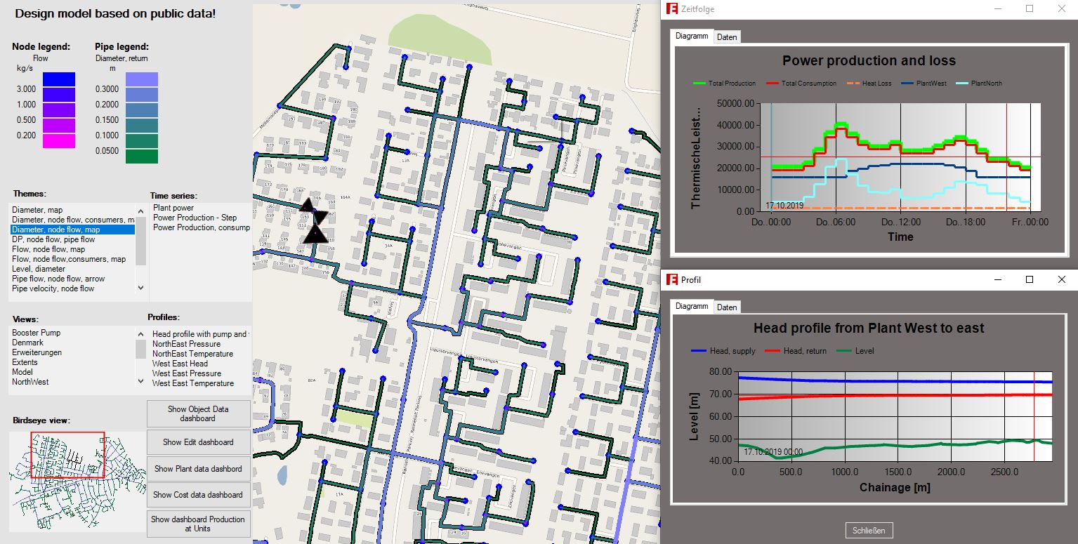 Mit einer speziellen Software können wir thermische und hydraulische Simulationen von Fernwärmenetzen und Fernkältenetzen durchführen. Damit können bestehende Netze optimiert und verbessert und neue Netze dimensioniert und geplant werden. Die hochpräzisen Berechnungen beruhen auf unterschiedlichsten Ausgangsparametern mit einer breiten Möglichkeit von Einflussfaktoren wie Geoinformationsdaten, DWG-Daten, Produkt- und Abrechnungsdaten, Wetterprognosen und Lastprofilen. Auch dynamische Simulationen und Simulationen mit Praxisdaten aus bestehenden Systemen können via SCADA-Schnittstelle im System miteinbezogen werden.